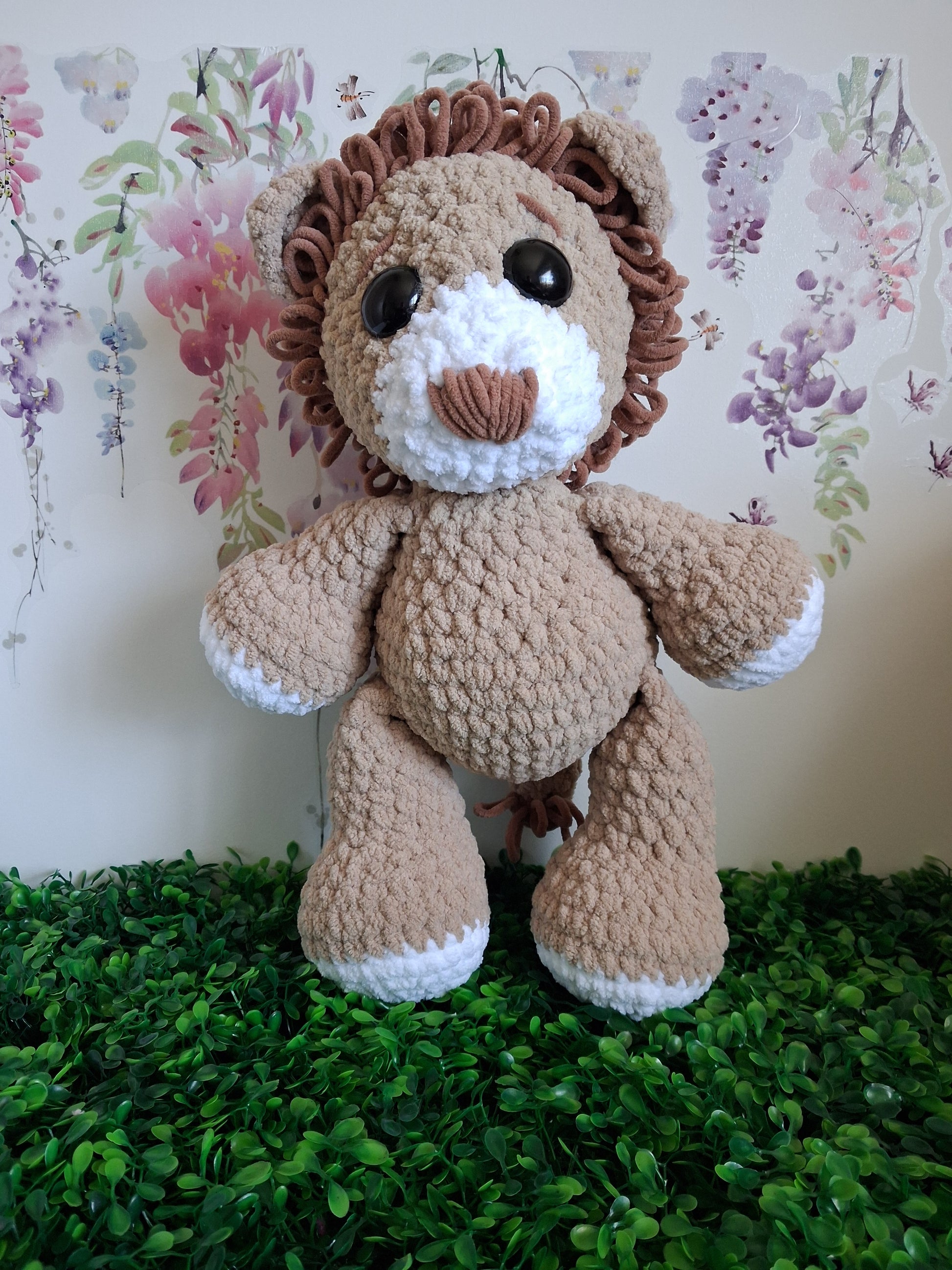 Meet the King of the Jungle – a magnificent plush companion standing 37cm tall and 28cm wide. Crafted from luxuriously soft chenille yarn, this cuddly giant is perfect for snuggling and imaginative play. Featuring bold black safety eyes and being such a generous size, he's an impressive addition to any collection. Recommended for ages 3 and up. Ideal for children who love wildlife-inspired toys and tactile comfort.