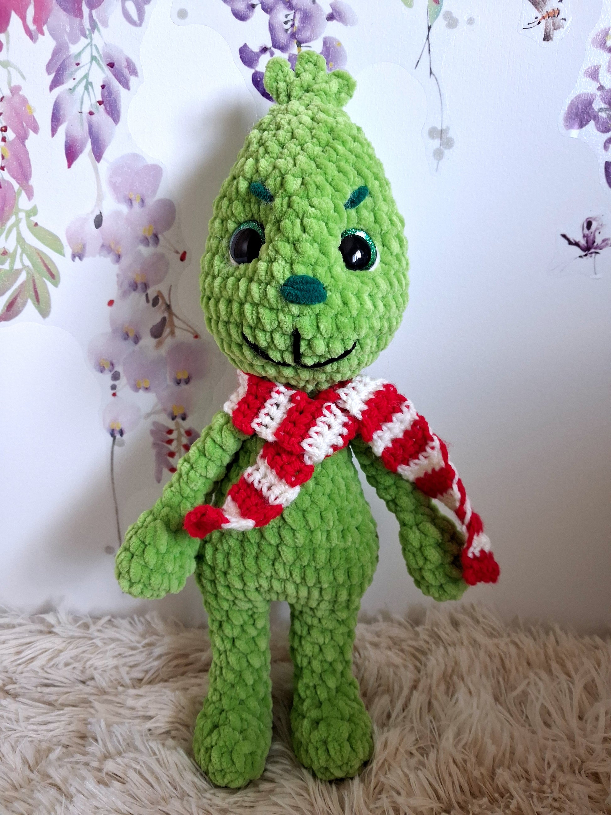 For a mean one Mr Grumpy is so adorable. He is made out of chenille yarn so very soft and cuddly. He is 33.5cm tall.
