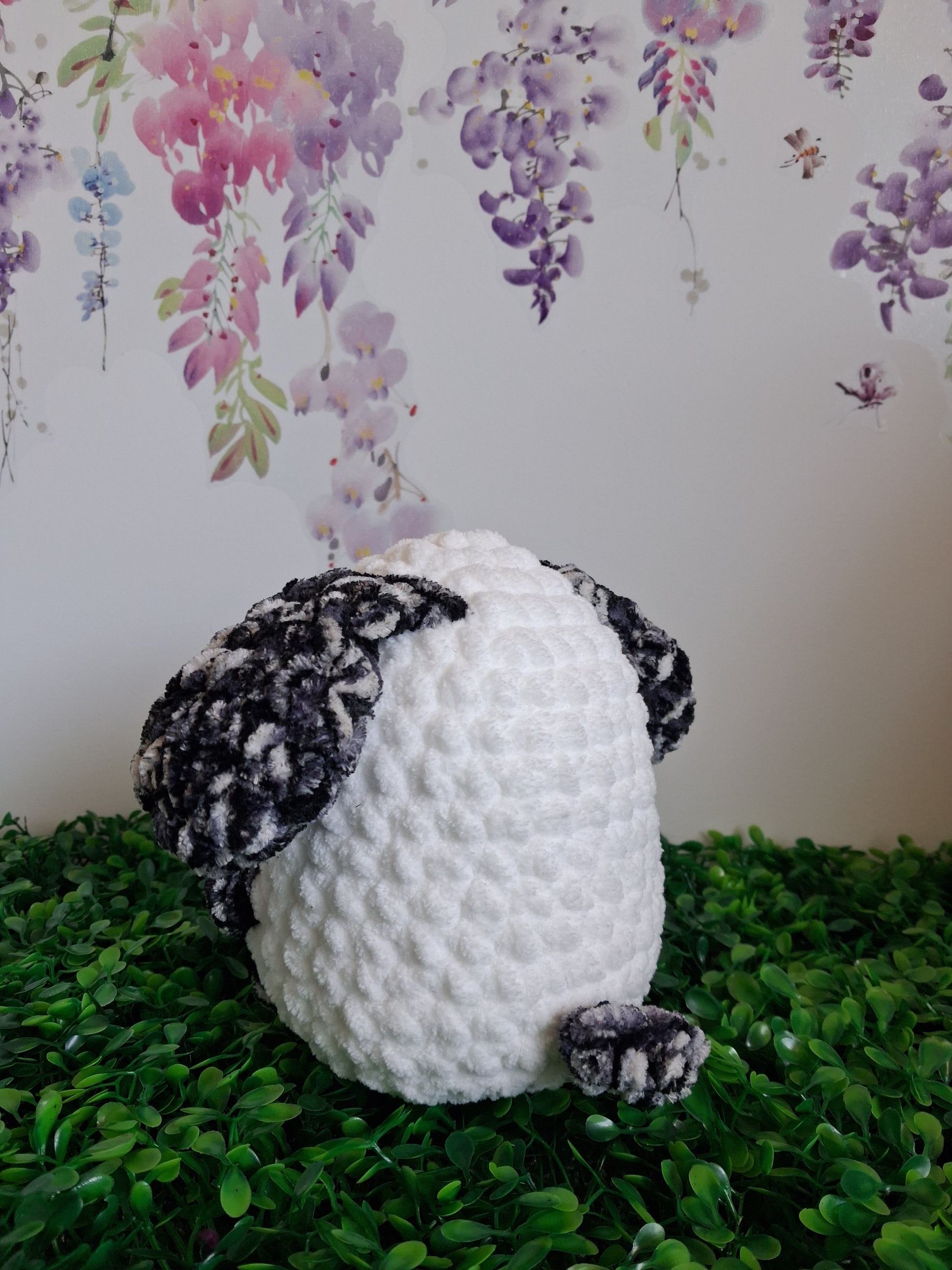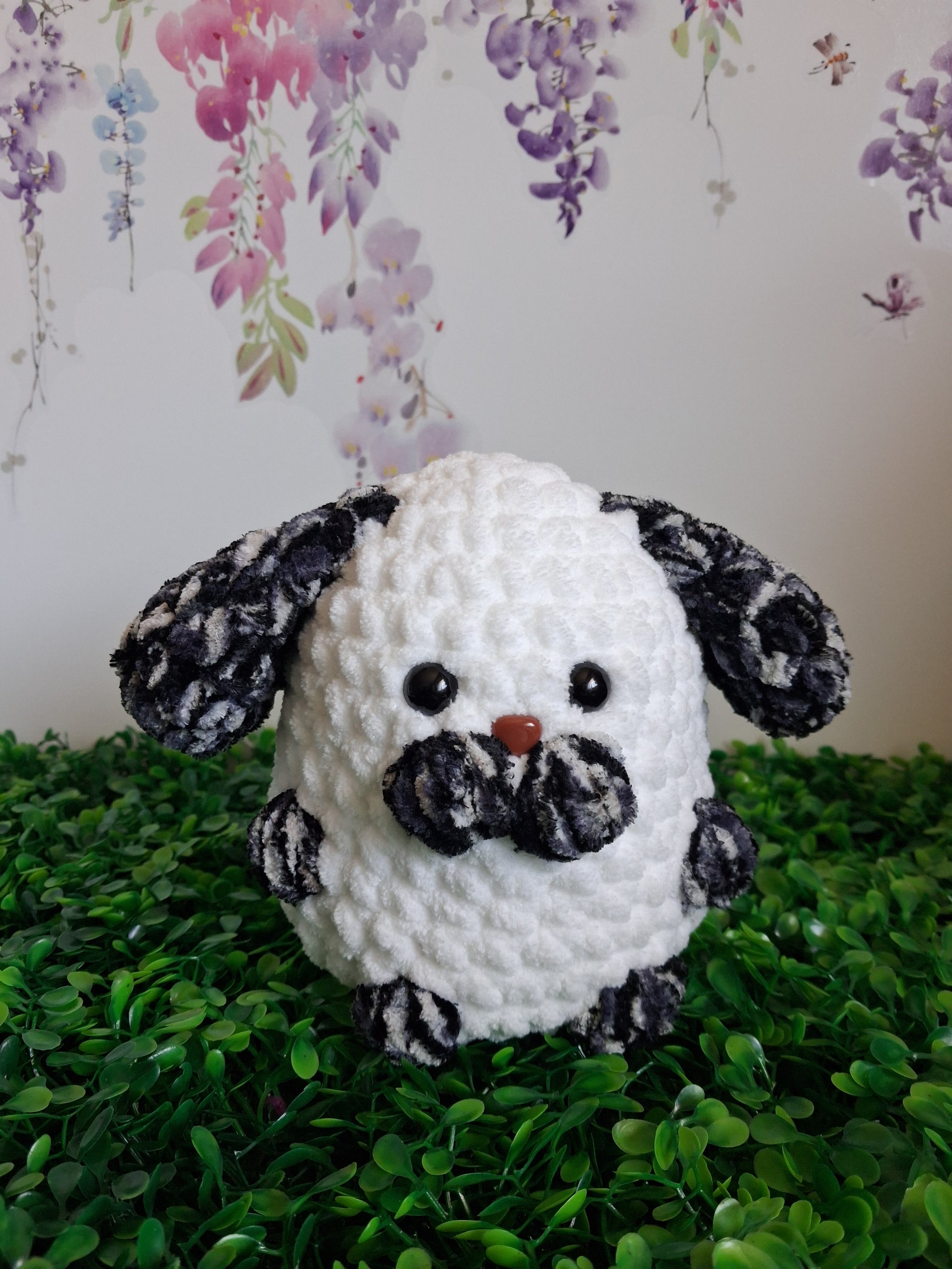 Meet your new cuddle companion! This adorable sitting dog features charming black and white colouring and oversized ears that give it irresistible character. Crafted from soft, chenille yarn, it's wonderfully huggable and perfect for snuggling. Measuring 15 cm x 12 cm, it's the ideal size for little hands to hold. Please note: Not suitable for children under 3 years due to safety eyes.