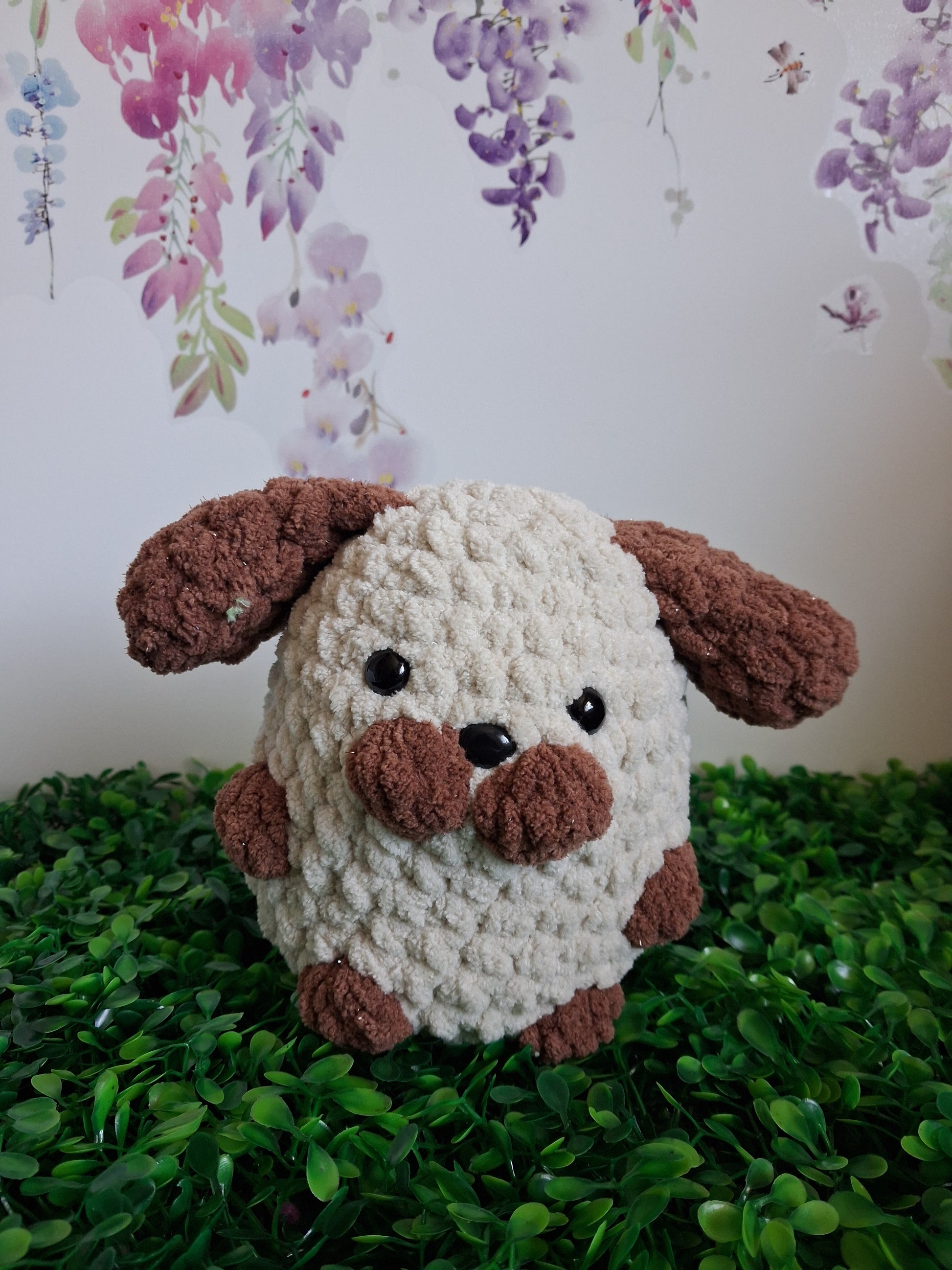 Meet your new cuddle companion! This adorable sitting dog features charming brown sparkling ears, feet, cheeks and tail and oversized ears that give it irresistible character. Crafted from soft, chenille yarn, it's wonderfully huggable and perfect for snuggling. Measuring 15 cm x 12 cm, it's the ideal size for little hands to hold. Please note: Not suitable for children under 3 years due to safety eyes.